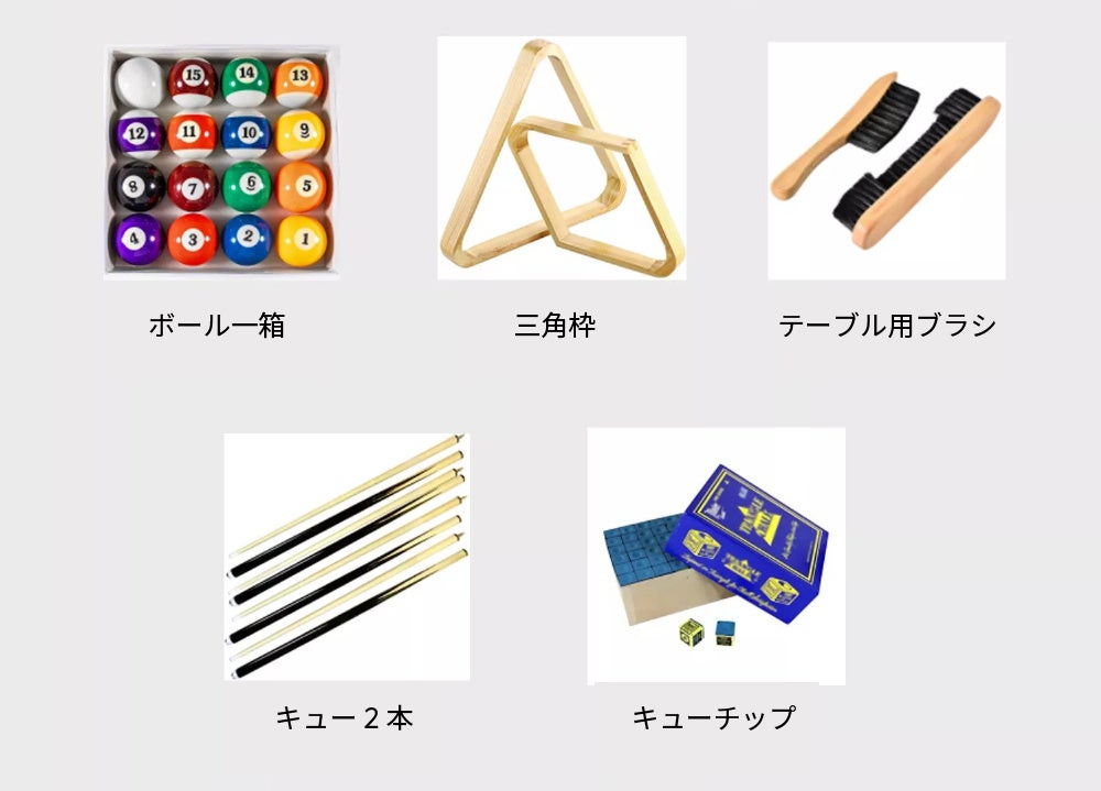 57mm ビリヤード ボール1箱、ビリヤード キュー 2本、三角枠 1、ブラシ 1 、チョーク 2